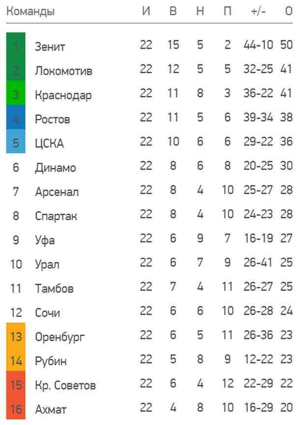 ЦСКА | 18 | 11 | 3 | 4 | 30-17 | 36 | |