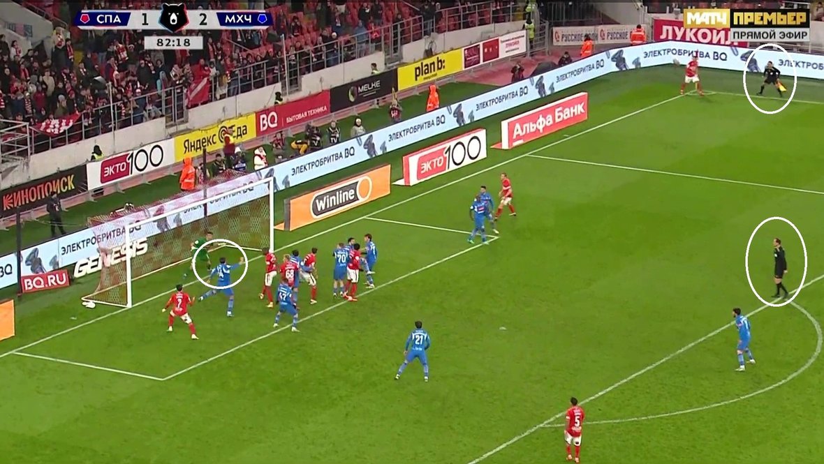 В 85-й раз в чемпионате России-2024/25 видеоассистенты вмешались в действия рефери. ВАР Евгений Буланов и АВАР Сергей Иванов провели проверку и предложили Мешкову посмотреть видеоповтор. Судья, который изначально находился далеко от Кирша, после просмотра повтора на мониторе у поля (ОФР) объявил об изменении решения и назначении пенальти в пользу «Спартака».