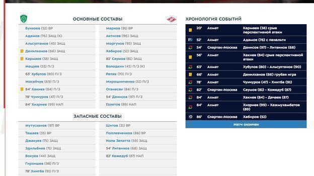 В составе "Ахмата" на 56-й минуте на замену вышел полузащитник Турпал Абзаев, который не был внесен в заявку на игру.