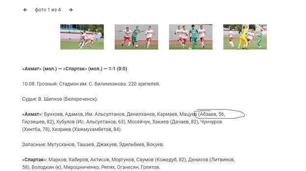 На сайте российской премьер-лиги в протоколе фамилия Абзаева отсутствует. Его имя значится в составе "Ахмата" в обзоре игры на официальном сайте "Спартака" футболист – он вышел на поле на 56-й минуте и был заменен на 82-й.