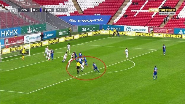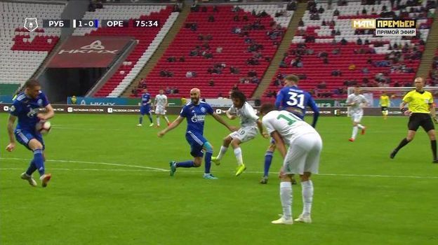 На самом деле мяч сначала попал в тело футболиста "Оренбурга" и только после этого коснулся руки. Защитник гостей при этом получил еще и желтую карточку.