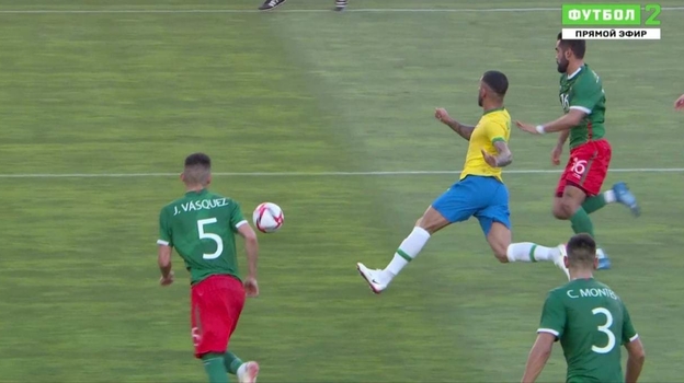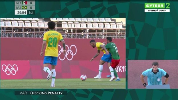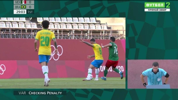 Похожий момент произошел на 28-й минуте полуфинального матча Олимпиады-2020 Мексика — Бразилия. Болгарин Георгий Кабаков назначил пенальти в ворота мексиканцев, решив, что Хосе Хоакин Эскивель Мартинес сбил Дугласа Луиза. На самом же деле бразилец, не пытаясь сыграть в мяч, сделал движение правой ногой и корпусом вбок, а соперник, бежавший сзади и правее, не успел избежать столкновения и врезался в него.