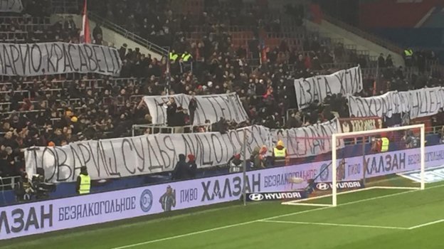 «Товарищ судья, лицо попроще сделайте». Баннер болельщиков ЦСКА в матче РПЛ