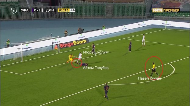 На 90+2-й минуте матча 29-го тура Тинькофф чемпионата России «Уфа» — «Динамо» (0:1) ошибся арбитр Павел Кукуян, не назначив 11-метровый удар в ворота хозяев поля. Он неверно оценил единоборство Артема Голубева с Игорем Школиком, в котором игрок уфимцев пытался в подкате выбить мяч, но ударил соперника в ногу. Судье следовало назначить пенальти и наказать нарушителя предупреждением.