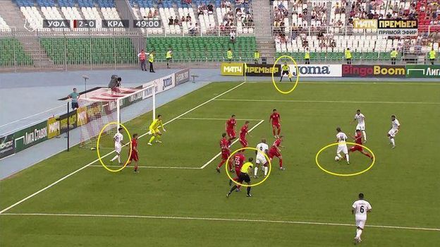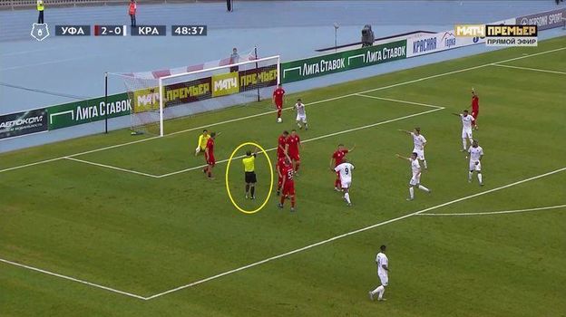 На самом же деле, как видно на видеозаписи, мяч в направлении Намли отправил уфимец Тилль. То есть положение "вне игры" фиксировать не стоило. После непродолжительных консультаций (возможно, с первым ассистентом Дмитрием Мосякиным или резервным Владиславом Безбородовым) Еськов свой первоначальный вердикт исправил и побежал к центру поля, засчитав гол "быков". (Александр Бобров)?
