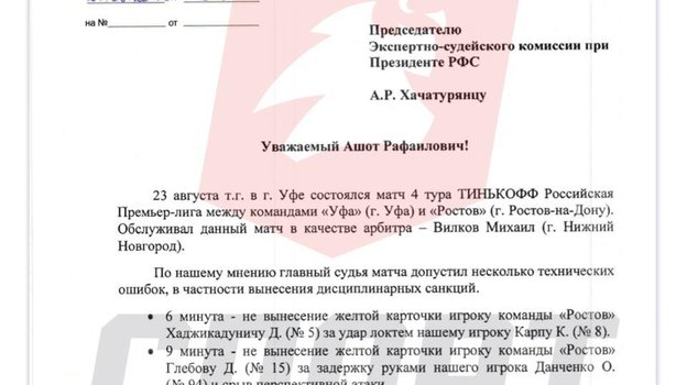 «Уфа» обратилась к председателю ЭСК Ашоту Хачатурянцу с просьбой дать оценку по пяти эпизодам в матче 4 тура против «Ростова». В клубе считают, что судья Михаил Вилков допустил ряд ошибок. (Севастиан Терлецкий)