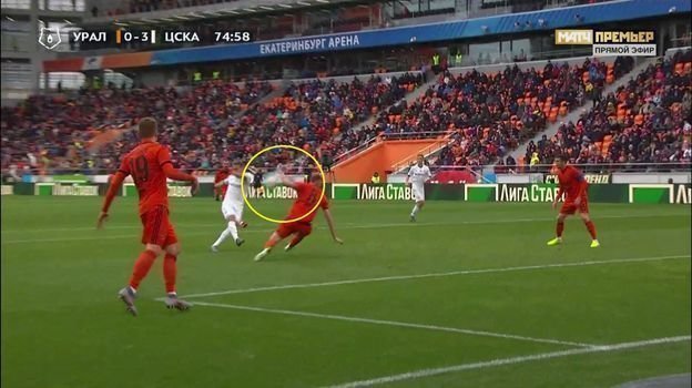 На 75-й минуте матча 11-го тура чемпионата России «Урал» — ЦСКА (0:3) арбитр Павел Кукуян принял верное решение, назначив пенальти в ворота хозяев поля и вынеся предупреждение Емельянову.