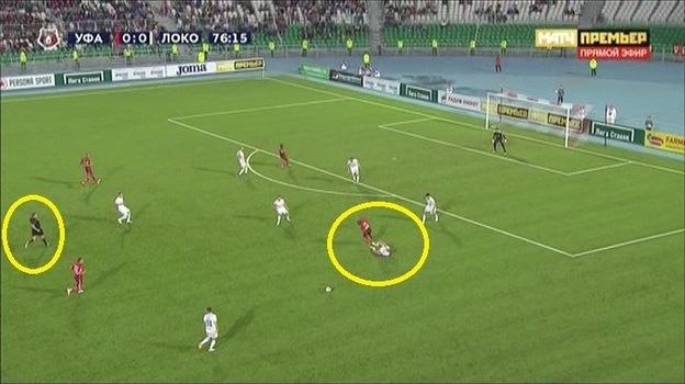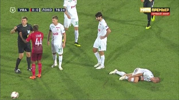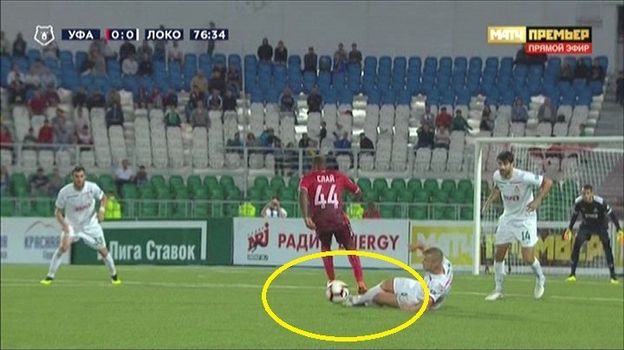 На 77-й минуте матча 1-го тура чемпионата России "Уфа" - "Локомотив" ошибся арбитр Михаил Вилков, не удалив игрока хозяев Игбуна, который ударил прямой ногой Баринова. Судья ограничился вынесением предупреждения. (Александр БОБРОВ)