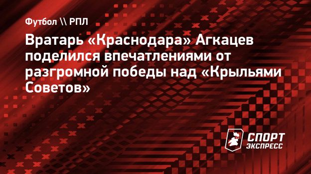 Вратарь «Краснодара» Станислав Агкацев поделился с «СЭ» впечатлениями от разгромной победы над «Крыльями Советов» (6:0) в матче 6-го тура РПЛ.