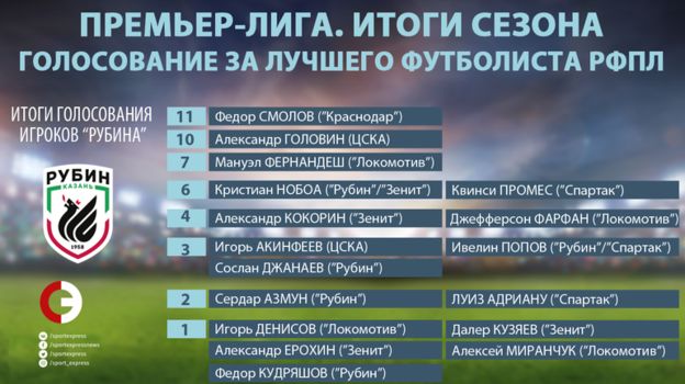 После голосования "Рубина" Смолов отстает от Фернандеша всего на два очка, в борьбе за третье место Головин опережает Промеса. Камболов считает лучшим игроком чемпионата Джанаева, Кузьмин – Акинфеева.
