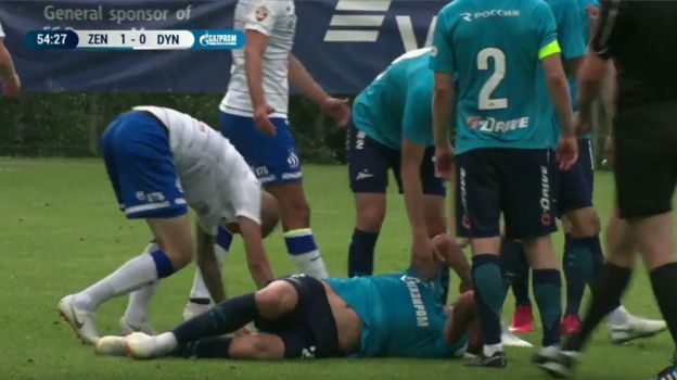 Сегодня, 8 июля, прошел товарищеский матч между "Зенитом" и "Динамо" (5:0). На 55-й минуте при счете 1:0 в пользу петербургской команды удар бутсой в голову получил форвард Антон Заболотный.