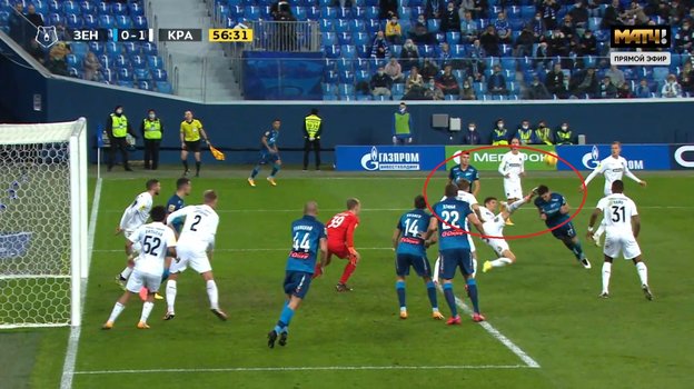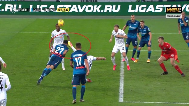 На 56-й минуте матча 14-го тура Тинькофф чемпионата России «Зенит» — «Краснодар» (3:1) ошибся арбитр Владимир Москалев, не зафиксировавший фол Александра Мартыновича и не назначивший пенальти в ворота «быков». В том моменте краснодарский защитник сыграл безрассудно, совершив прыжок в своей штрафной площади и попав ногой в голову Магомеду Оздоеву.