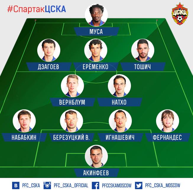 Внимание! Состав ЦСКА: Акинфеев – Мариу Фернандес, Игнашевич, В. Березуцкий, Набабкин – Натхо, Вернблум – Тошич, Еременко, Дзагоев – Муса. Запасные: