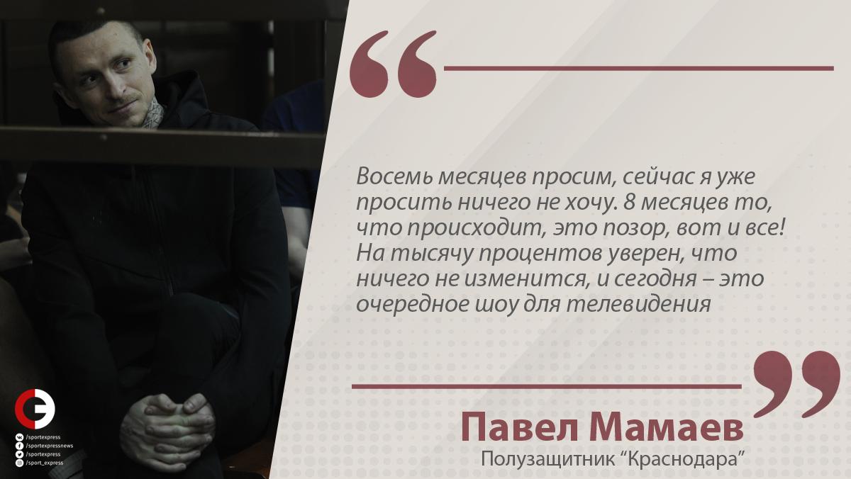"Суд отдает все время предпочтение словам обвинения. Ни разу наши показания не были изменены, в отличие от потерпевших. Каждый из нас признал вину именно в содеяном, а не в том, что нам пытаются вменить. Что касается меня, то по первому эпизоду с Соловчуком я действительно нанес два удара, я в этом раскаиваюсь и принес извинения. Во втором эпиоде я не понимаю, в чем вообще заключается смысл правосудия. Только когда его действия были направлены в сторону Павла Мамаева, я предотвратил конфликт. Я его удержал, отвел в сторону, после чего мы с ним спокойно разговаривали, это есть на видео.Если бы я применил силу, то у нас бы этого разговора не было.