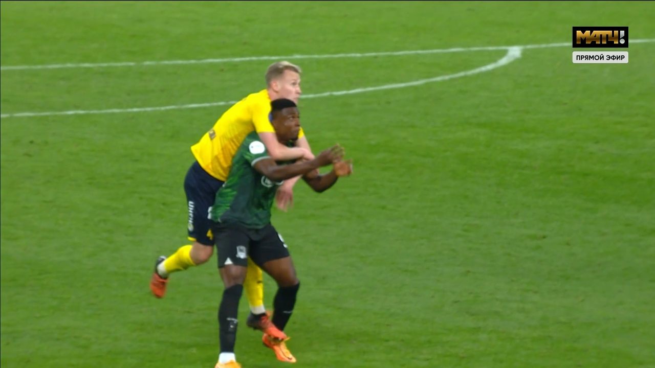 15-я минута. Волков остановил забег Мохеби по флангу только с помощью фола и предупреждения.