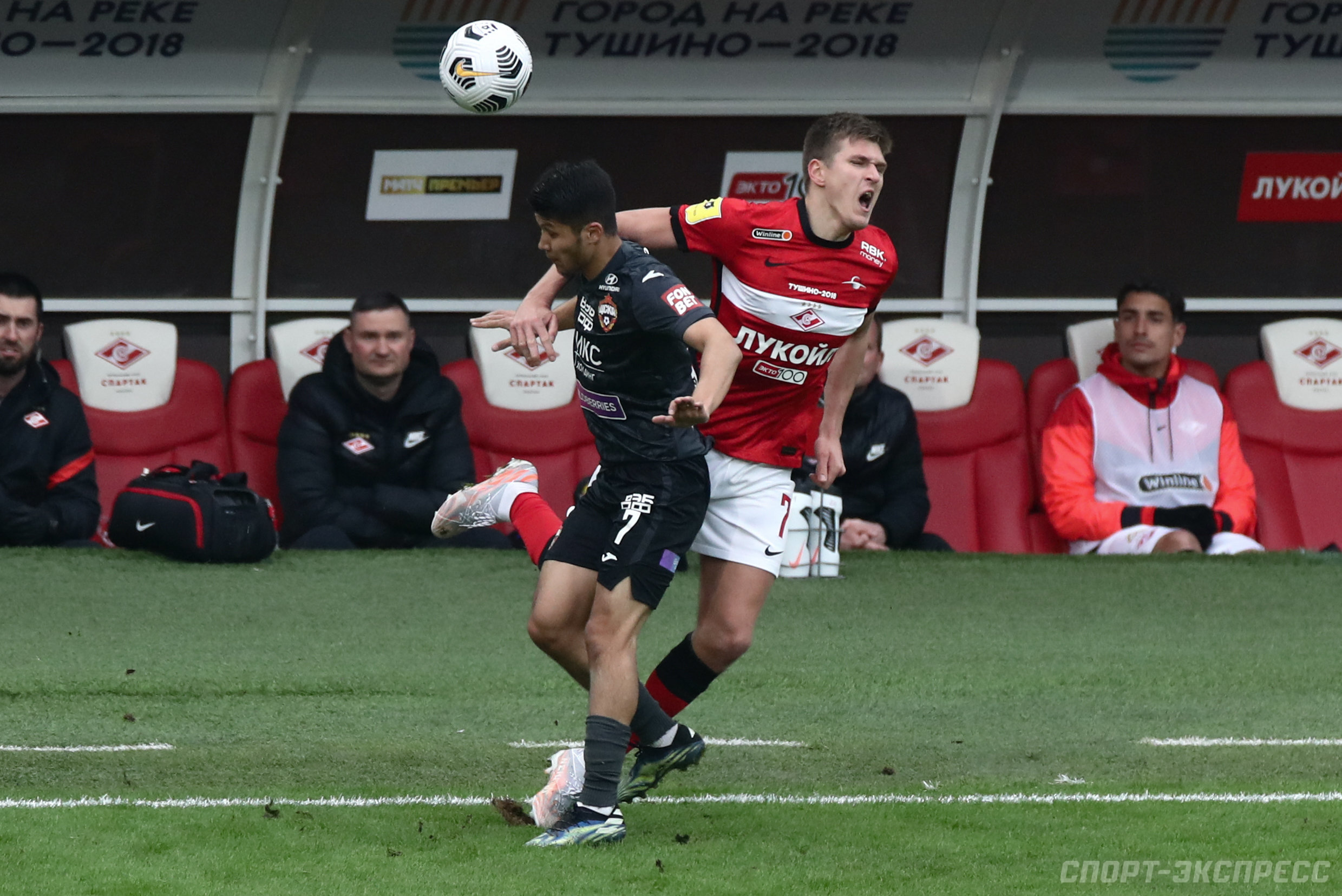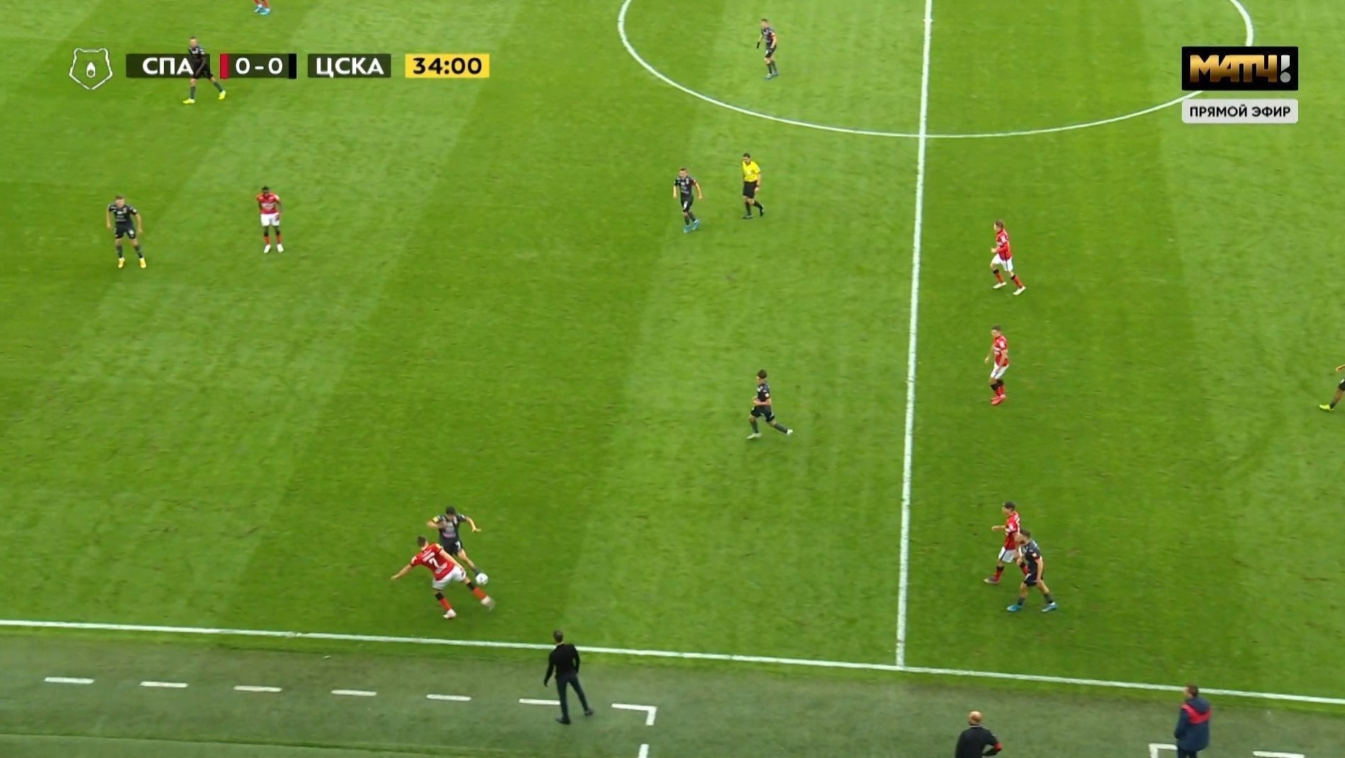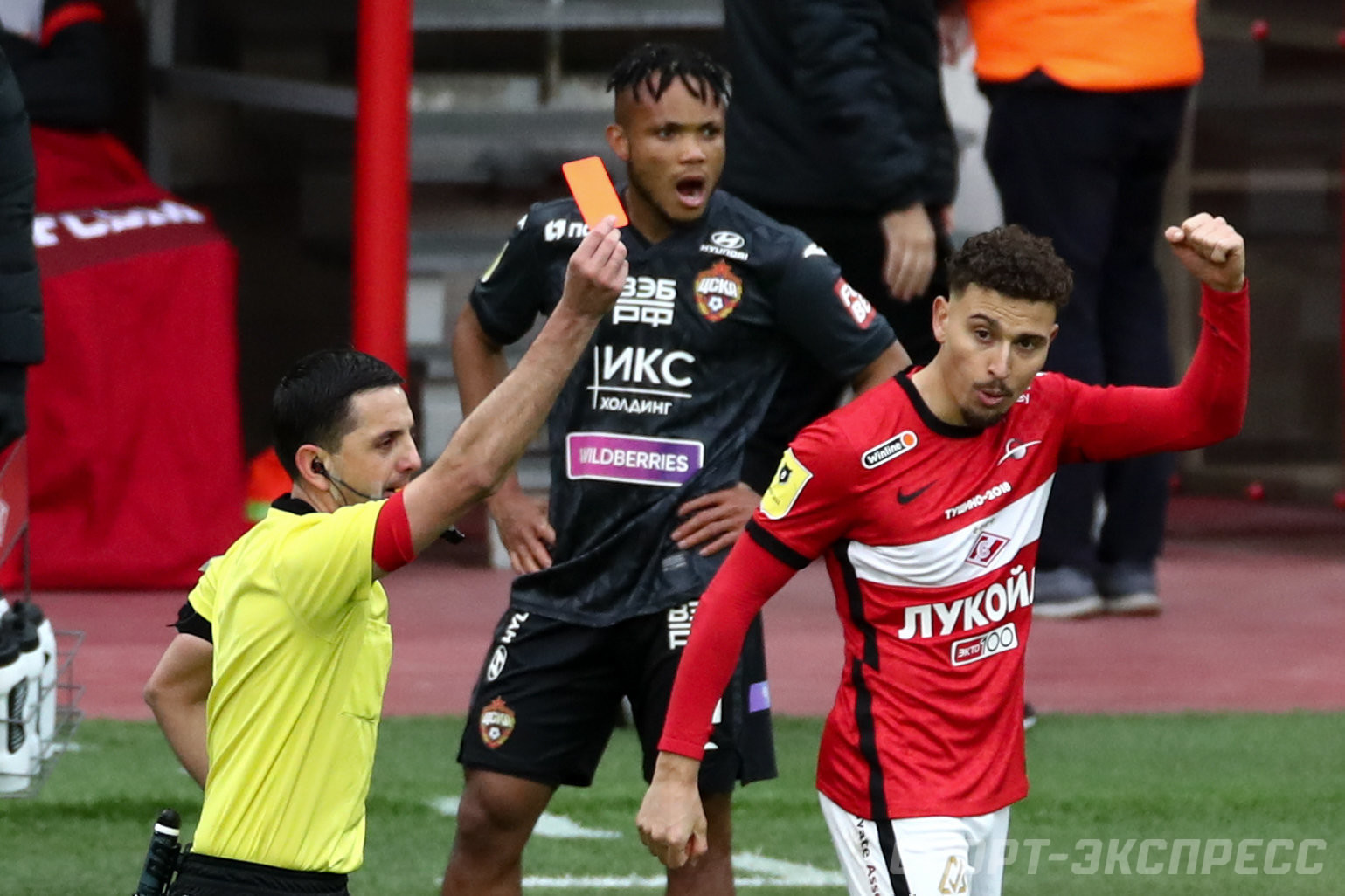 На 37-й минуте после стыка с форвардом соперника Александром Соболевым в центре поля у технической зоны красно-белых красную карточку полузащит хавбек ЦСКА Ильзат Ахметов. Главный судья Павел Кукуян принял это решение после просмотра повтора, когда в игру вмешался ВАР Сергей Карасев.