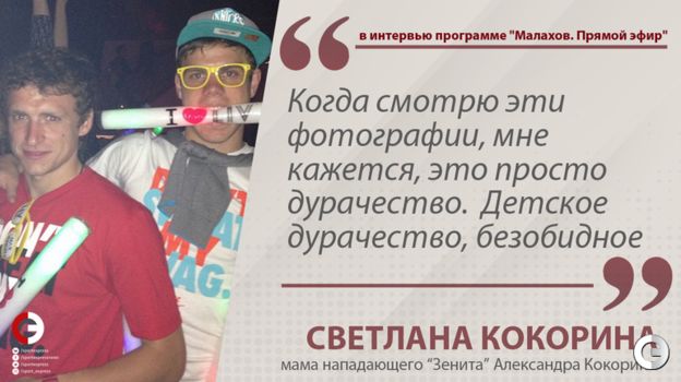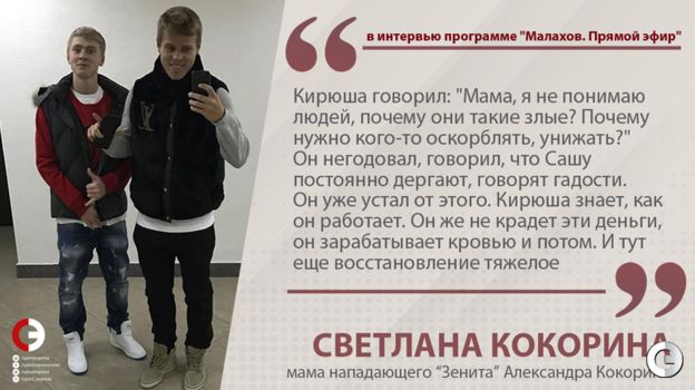 В эфир телеканала "Россия" вышла программа "Прямой эфир" с Андреем Малаховым. Популярный ведущий взял интервью у Светланы Кокориной, матери форварда "Зенита" Александра и Кирилла. Оба были помещены под стражу на прошлой неделе по решению Тверского суда Москвы по делу об избиении водителя ведущей Первого канала и двух чиновников Минпромторга. "СЭ" выбрал главные цитаты. Видео эфира – здесь.