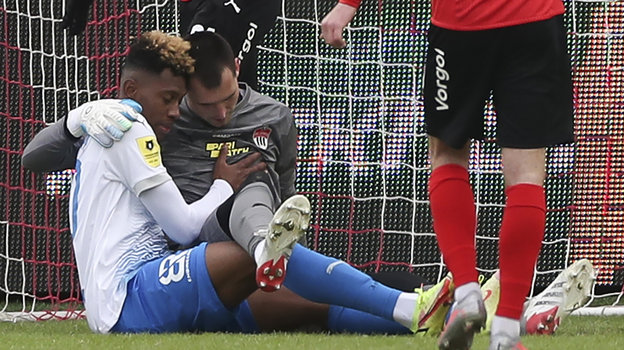 Страшное падение вратаря Адамова: кадры матча «Химки» — «Сочи»