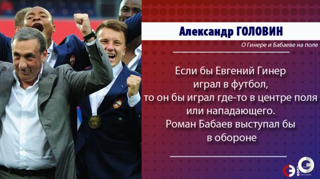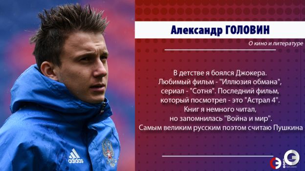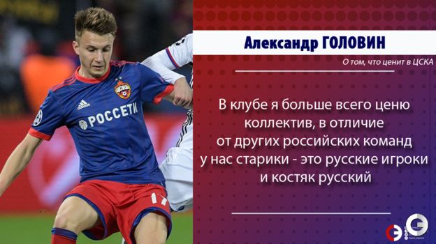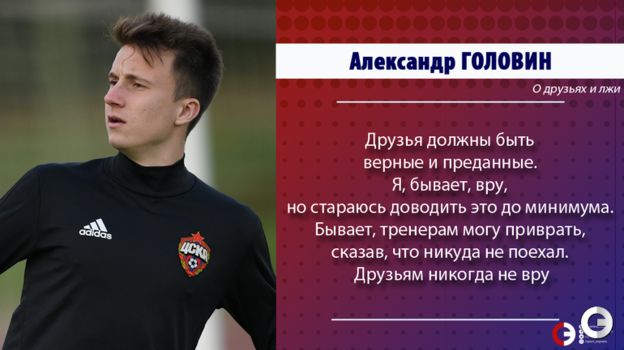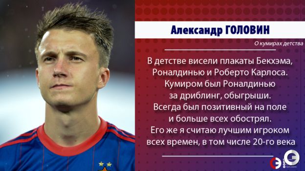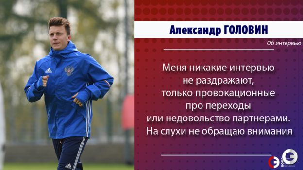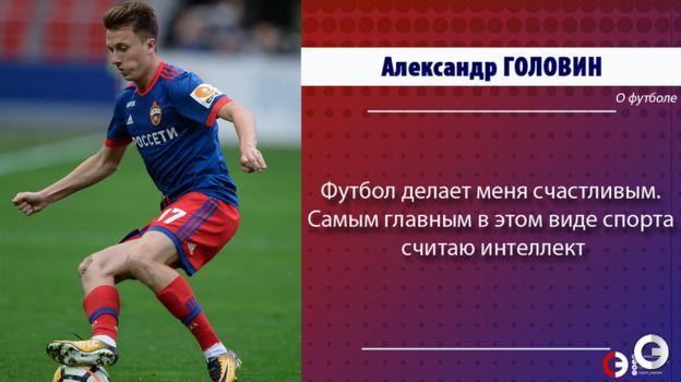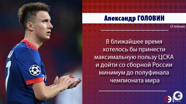 Полузащитник ЦСКА и сборной России Александр Головин в эфире клубного телевидения заявил, что вместе с национальной командой хочет дойти минимум до полуфинала чемпионата мира-2018. По словам 21-летнего хавбека, если бы президент армейцев Евгений Гинер играл в футбол, то он бы выступал на позиции полузащитника или нападающего.