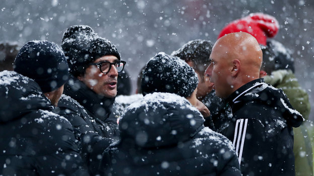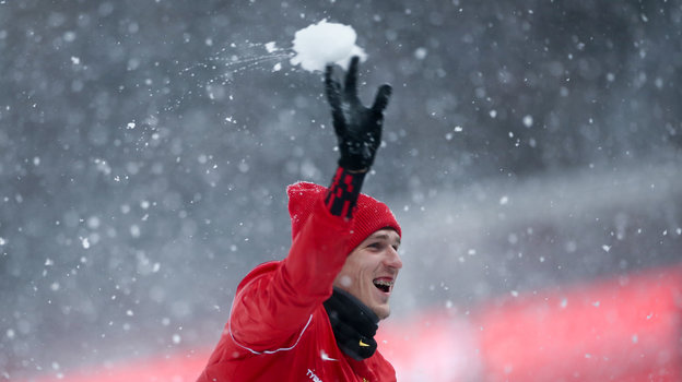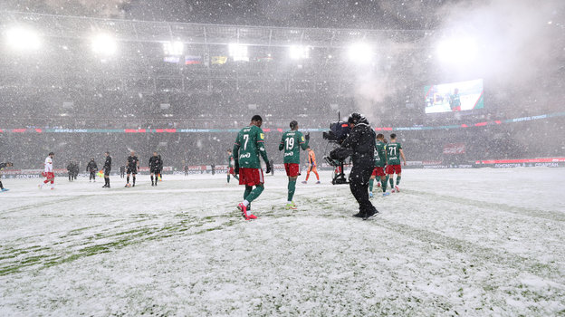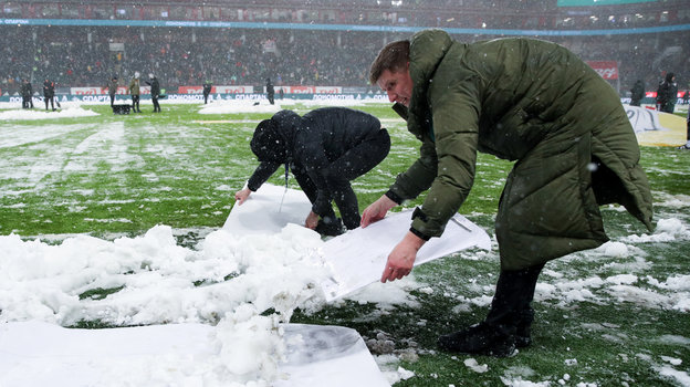 Начало игры было перенесено на час из-за обрушившегося на Москву снегопада. Фото — здесь.