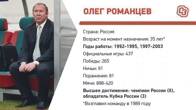 Статистика «СЭ» по главным (и исполняющим обязанности главного) тренерам «Спартака» в российской истории. Назначенный вчера главным тренером команды Доменико Тедеско — самый молодой из них. Ему всего 34. Ставший самым титулованным в истории красно-белых Олег Романцев принял команду в 35 лет.