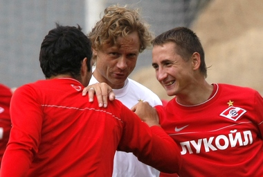 Тренировка, надо отметить, была вчера у красно-белых не единственная. Среда стала для футболистов первым рабочим днем после игры с "Крыльями". По этому поводу тренеры решили их нагрузить. И нагрузили. Пот тек ручьями даже с сухопарых, не говоря уж про не обиженных мышцами. А Быстров, шутливо страдая в попытках дотянуться до призовой послетренировочной фляги с водой, и вовсе рухнул на газон. Правда, тут же вскочил. Увидел, что окончание занятия команда решила отметить ритуалом невсамделишного вдавливания в землю главного мучителя Оскара Гарсии. На испанца, громко гогоча, навалилось человек двенадцать. Забывший о воде Быстров запрыгнул сверху. Чувствовал ли старина Оскар, что все происходит с ним понарошку, либо отчаянно боролся с приступом клаустрофобии, неведомо. Разошлись все живыми и веселыми. Карпин охарактеризовал произошедшее так: "Команда захотела Гарсию отдубасить".