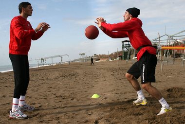 Тройка же вратарей (опять без Плетикосы) отправилась тем временем вместе со своим новым профильным тренером Валерием Клейменовым туда, где волны ласково лижут морской песок. И на пляже провела два не самых курортных часа. Жесткий резиновый жгут, привязанный к столбу, зыбкая почва под ногами, специальный трехкилограммовый мяч - и работа, работа, работа. На боковые и приводящие, на сгибательные и толкательные, на внутрибедерные и межреберные - да на все подряд вратарские мышцы. Предположительно именно этой каторгой будут заменять для голкиперов всякий кросс команды по душистому турецкому лесу.