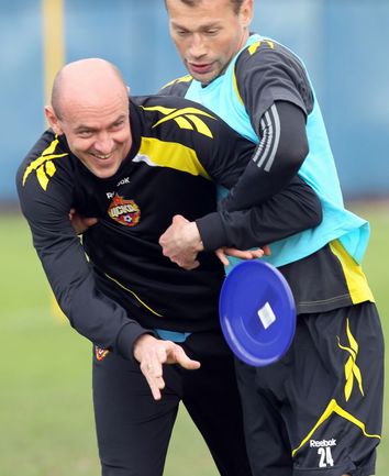 Веселье на этом не закончилось. Для начала разбитым испанским тренером по физподготовке Паулино Гранеро на две команды игрокам выдали регбийный мяч, потом его сменил фрисби. И с овальным снарядом, и с летающей пластиковой тарелочкой смеха на поле хватало. Слаломные рейды не приветствовались. Даже вошедшего в игру Виктора Онопко свистком одернули. Во главе угла - точнее, самого упражнения, поскольку никаких углов не было - стоял пас. Пусть и не футбольным был мяч, с "дыней" армейцы обращались куда лучше, а вот специалистов по тарелочке - особенно при бросках на дальние дистанции - оказалось меньше. Та все норовила улететь то вверх, то вниз, но никак не в руки. К негодованию Мамаева и его товарищей. А в паузах при командах "разбейтесь на четверки/тройки/пары" в итоге проиграл Игнашевич. Схватившись за Онопко, защитник обрек себя на прохождение через "строй". Все в рамках приличного.