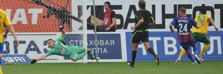 Краснодарцы едва не забили на первой минуте. Пока команда Слуцкого вкатывалась, подопечные Дана Петреску выдали первую острую атаку. Армаш замкнул подачу справа из района 11-метровой отметки - мяч пролетел рядом с левой штангой. Красно-синие для порядка ответили своим выпадом - Думбья, Вагнер и снова Думбья. Последний едва не замкнул передачу партнера с близкого расстояния, но промахнулся мимо красивого гола. В целом же стартовый отрезок остался за гостями. Но когда ЦСКА прихватил инициативу и стал поддавливать соперника, тот как будто согласился заняться обороной. Умело, организованно. Хозяевам же явно не хватало скорости - и движения, и мысли. Как только Алдонин и Хонда ею блеснули, Думбья выстрелил из-за штрафной выстрелом в перекладину. Чуть позже Вагнер при помощи того же Хонды вывалился по центру, в борьбе в Армашом не проткнул Будакова и завалился на газон без права на пенальти. Так и провели тайм команды: одни натужно наступали, другие спокойно защищались.