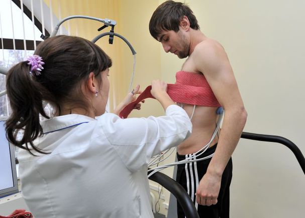 Перекусив, игроки отправлялись в путь по кабинетам других врачей, а завершали процедуру тестом на тредмиле - забегом по движущейся дорожке с постоянно увеличивающейся скоростью. Спортсмен должен бежать, пока есть силы. Таким образом проверяется работа сердца и дыхательной системы при максимальных нагрузках. В этом испытании не для всякого да недолгой работе на велотренажере и заключается бросающаяся в глаза разница между обследованием профессиональных спортсменов и диспансеризацией тех, кто трудится на ином поприще.