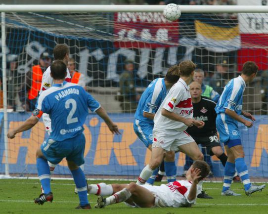 В ответном матче в Москве сильнее снова оказались красно-белые. На исходе получаса игры Торбинский проскочил по левому флангу, отпасовал в штрафную, где Павлюченко "перевисел" в воздухе Анюкова и рикошетом от перекладины отправил мяч в ворота. Звон от растревоженного каркаса зенитовских ворот был таким оглушительным, что его услышали, пожалуй, на всех секторах стадиона.