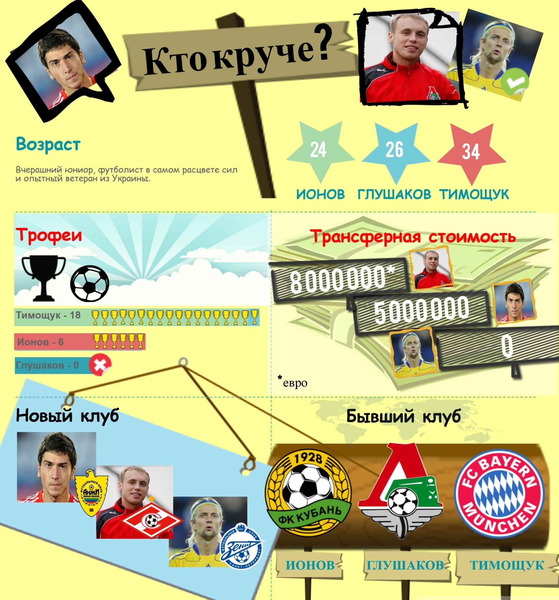 "СЭ" сравнил три главных летних трансфера в российской премьер-лиги: возвращение Анатолия Тимощука в "Зенит", переход Дениса Глушакова из "Локомотива" в "Спартак" и Алексея Ионова – из "Кубани" в состав "Анжи": сумма трансферов, личные характеристики и достижения футболистов.