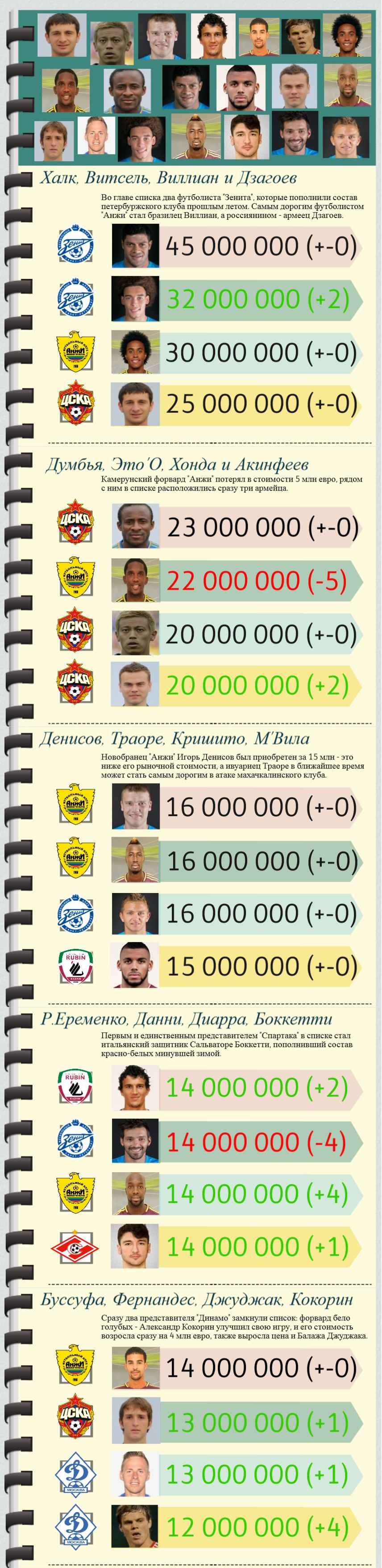 Махачкалинский "Анжи" имеет самое большое представительство в первой двадцатке: помимо уже упомянутого Виллиана – это камерунец Самюэль Это'О, чья стоимость продемонстрировала рекордные темпы падения (минус 5 000 000), новобранец Игорь Денисов, ивуарийский форвард Ласина Траоре, французский полузащитник Лассана Диарра и атакующий хавбек Мубарак Буссуфа из Марокко.