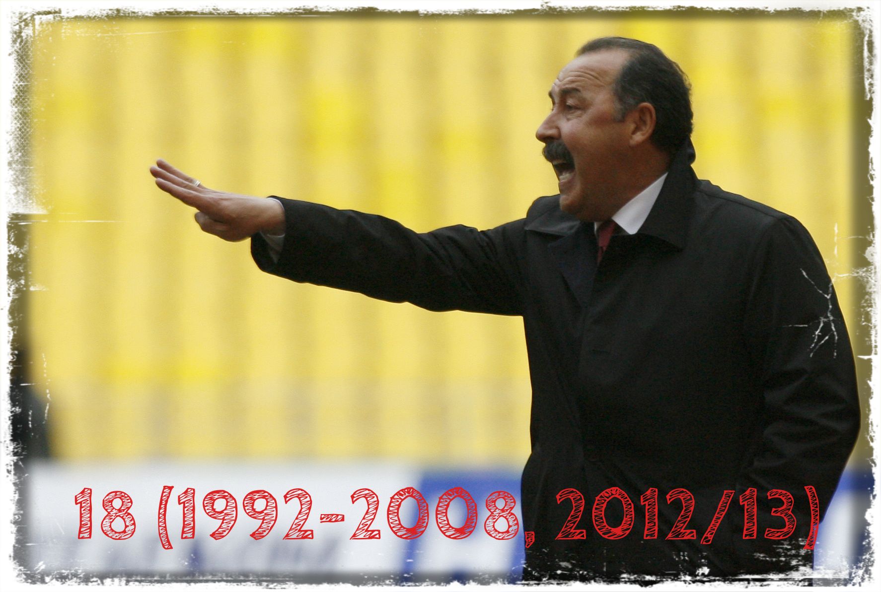 18 сезонов имеет за своими плечами Валерий Георгиевич в качестве главного тренера клубов элитного российского первенства: в начале 90-х он работал в московском "Динамо" (1992 - 1993), далее пять сезонов возглавлял "Спартак-Аланию" (1994 - 1999) и вновь "Динамо" (1999 - 2001). Армейцев Москвы Газзаев также тренировал дважды: в 2001 - 2003 годах и после недолгого отсутствия – в 2004 - 2008-м. После двухгодичного вояжа на Украину в киевское "Динамо" в сезоне-2012/13 наставник вернулся в премьер-лигу, где взял на себя роль главного тренера (до этого выполняя функции президента) родного клуба из столицы Северной Осетии. Таким образом, на его счету 485 матчей. 13 сезонов отработал в качестве наставника Олег Иванович: с московскими "Спартаком" и "Динамо", а также раменским "Сатурном". Его послужной список – 333 поединка.