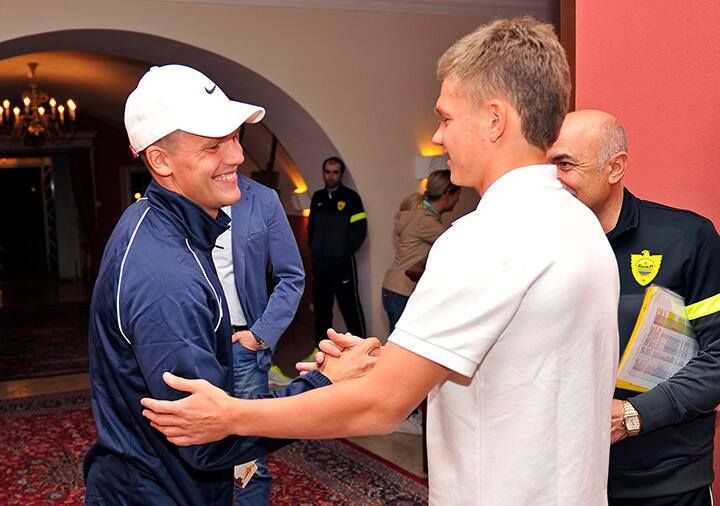 Игорь Денисов_1: новичок прибыл в расположение команды в австрийском Ирднинге. Олег Шатов первым из футболистов приветствует Игоря.