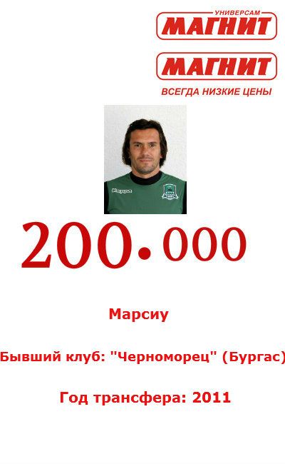 Покупка молодого белоруса – настоящая находка "быков". Надежный центральный защитник за такие смешные деньги – это уже успех, а когда у него появляется российский паспорт, то успех вдвойне. Мартынович быстро стал в Краснодаре своим и дорос до капитана. Сегодня его трансферная стоимость уже два миллиона евро. Одна беда – с этого сезона он считается в РФПЛ легионером, ведь заигран за сборную Белоруссии.