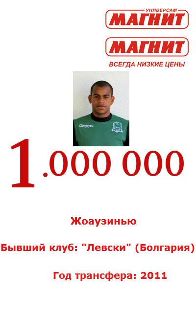 Пожалуй, главная из всех трансферных "жемчужин" "Краснодара". И снова найдена она в Болгарии, в "Левски". В премьер-лиге Жоаузинью провел 56 матчей, забил 9 голов, отдал 20 голевых передач, стал лучшим ассистентом прошлого сезона. С таким подносчиком снарядов любому форварду будет просто повысить свою результативность. Никто не удивится, если бразильца пригласят в большой клуб, вот только заплатить за него придется куда больше одного миллиона. Сейчас стоимость Жоаузинью оценивается в семь раз выше.