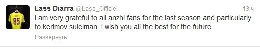 После начала перестройки в "Анжи" фамилия француза всплыла одной из первых, что называется, на выход. Поговаривают, что игрок просил у руководства махачкалинцев отпустить его бесплатно. Тогда он мог перебраться во французский чемпионат, где к нему присматривались местные олигархи из "Монако" и "ПСЖ". Однако хавбек не смог получить заманчивых финансовых гарантий и самым выгодным предложением счел сумму контракта от московского "Локомотива" (также к нему приценивался "Рубин"). Хотя первоначально оставаться в России не хотел. О сумме сделки по его переходу официально не сообщается, но, по данным transfermarkt.de, она составила 12 миллионов евро. Вслед за игроками к выходу потянулись и болельщики. Вчера появилась информация, что фанаты массово требуют возврата денег за дорогие абонементы на "Анжи-Арену". Как бы то ни было, Диарра попрощался с болельщиками "Анжи" и Сулейманом Керимовым через твиттер, пожелав своей бывшей команде удачи: