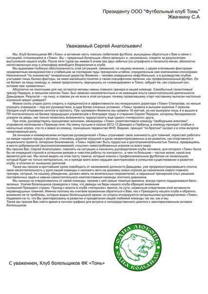 "Мы выражаем глубокую обеспокоенность этой ситуацией, связанной, по нашему мнению, с двумя ключевыми факторами: неадекватным менеджментом и слабейшим за последние годы тренерским штабом. В связи с этим мы просим в кратчайшие сроки освободить от занимаемой должности Давыдова". Актив клуба болельщиков также настаивает на смене генерального директора "Томи" Артема Фоменко и наложении вето на дозаявку новых игроков до назначения нового главного тренера".