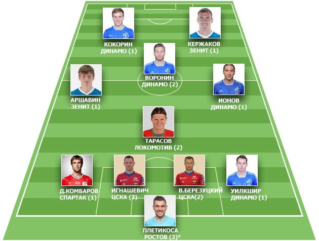 Александр КОКОРИН (1) Динамо - 7,0. Забил очередной красивый мяч, открыв счет. В дальнейшем помог отличиться Воронину, оформившему дубль после удобной скидки партнера по нападению.