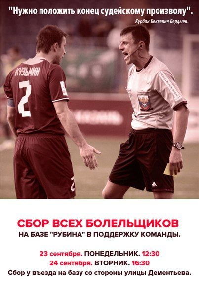 "Болельщики футбольного клуба "Рубин" пришли на базу клуба, чтобы высказать слова поддержки команде и главному тренеру. На встречу пришли около двухсот поклонников казанской команды. На базу клуба впустили абсолютно всех пришедших: и болельщиков, и представителей СМИ. После небольшого ожидания, к собравшимся вышел главный тренер команды Курбан Бердыев и команда в полном составе. Наставник "Рубина" поблагодарил собравшихся за поддержку. В свою очередь болельщики задали вопросы команнде, а также пожелали здоровья получившему травму Саломону Рондону и высказали о намерении жаловаться на несправедливое отношению к клубу в специальные инстанции. Поклонники "Рубина" собрали соответствующую петицию, которую подписал сам Курбан Бердыев".