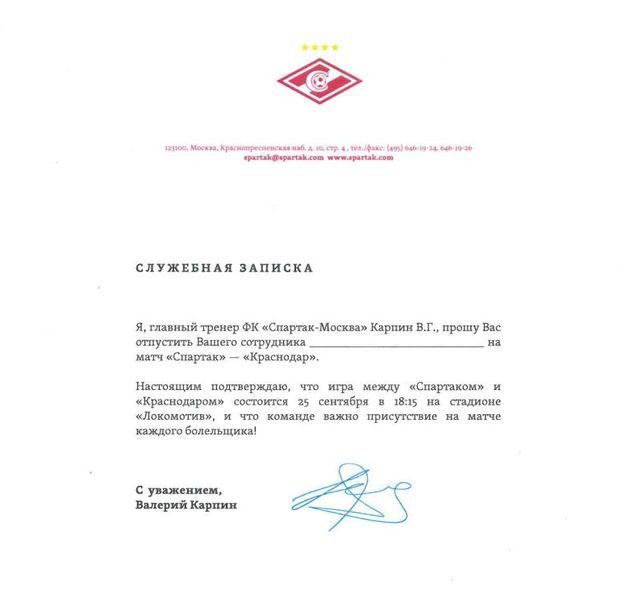 "Мы понимаем, что вы не всегда можете поменять ваши планы с той же скоростью, с которой меняется время начала матча в нашем чемпионате. Очевидно, что раннее начало матча "Спартак" – "Краснодар" в рабочий день многим может создать сложности. Мы готовы, в меру возможностей, помочь вам! Специально для тех, у кого суровое начальство, для тех, у кого горят все дедлайны, для тех, чей коллектив не разделяет страсть к футболу... мы подготовили служебную записку за подписью Валерия Карпина. Скачайте и распечатайте файл, впишите своё имя – и ваша объяснительная готова. Теперь уже ни один босс не сможет помешать вам посмотреть футбол на стадионе и ощутить невероятные эмоции от игры любимой команды".