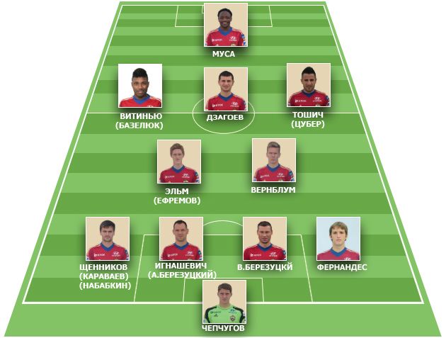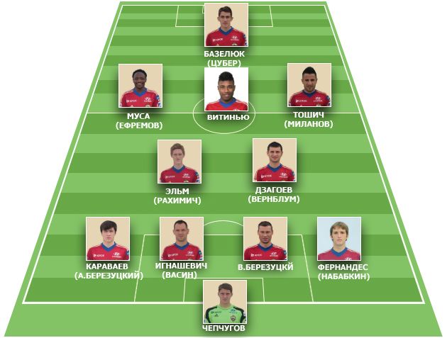 По сравнению с предыдущим матчем в стартовом варианте произошло два прогнозируемых изменения. С первых минут игру начали Щенников и Тошич, причем серб на этот раз расположился на правой бровке. С началом второго тайма в центре обороны образовалось третье за 180 минут сочетание: успевший поиграть на израильском турнире с обоими Березуцкими Игнашевич отправился отдыхать, а за самый важный участок защиты стал отвечать братский дуэт. Впрочем, три армейских старожила так долго играют вместе, что могут действовать в любом сочетании. А вот потерявшего голевое чутье Мусу Слуцкий перевел на левый фланг вместо замененного Витинью. Место нигерийца на острие вновь занял Базелюк – и опять смотрелся предпочтительнее африканца. Остальные футболисты, включая занявшего место в опорной зоне Ефремова, появились на привычных им позициях.