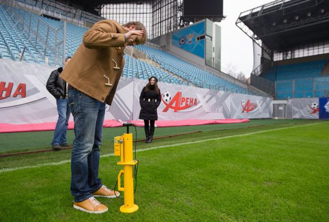 Потому для футбольного поля газон в Химках более чем качественный. Корреспондент "СЭ" проверил это не только на взгляд – благодаря исключительной вежливости работников стадиона удалось провести самую что ни на есть настоящую инспекцию поля. С помощью специального устройства. Все, как у людей, все, как у профессионалов.