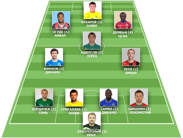 "СЭ" представляет свой вариант символической сборной 20-го тура чемпионата России. В ней представлены сразу 8 клубов, что говорит о напряженной борьбе в большинстве матчей. Отметим удачный дебют амкаровца Огуде, отметившегося дублем.