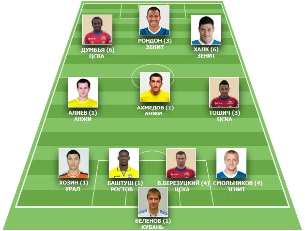 "СЭ" представляет свой вариант символической сборной тура чемпионата России. В нее попали по три игрока участников золотой гонки ЦСКА и "Зенита" и два футболиста "Анжи", который, сенсационно разгромив "Динамо", возродил в сердцах своих поклонников надежду на спасение. Обращаем внимание на мощное зенитовско-армейское трио в атаке: Халк – Рондон – Думбья.