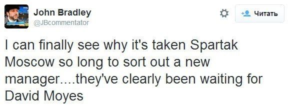 Футбольный комментатор Джон Брэдли выдвинул ироничную идею, сопоставив отставки главных тренеров в "Спартаке" и "Манчестер Юнайтед": "Теперь я понимаю, почему "Спартак" так долго тянул с назначением нового главного тренера. Очевидно, что они ждали Дэвида Мойеса".