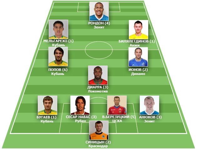 "СЭ" представляет свой вариант символической сборной 28-го тура чемпионата России. Атакующую связку в ней составили южноамериканцы – венесуэлец Рондон из "Зенита" и универсальный парагваец Мельгарехо, который в начале чемпионата играл за "Краснодар" на месте защитника.