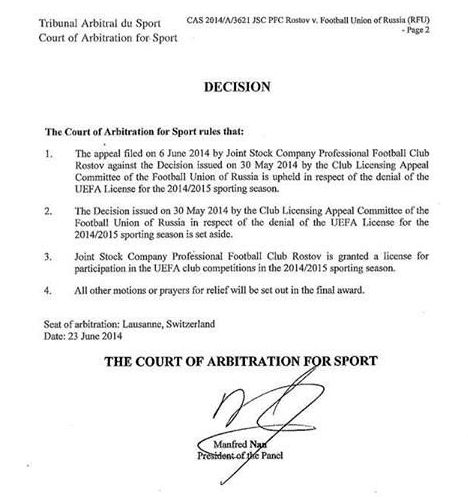– Что "Ростову" удалось доказать в Лозанне? Объяснения РФС, что клуб слишком поздно погасил задолженности, выглядели убедительно.