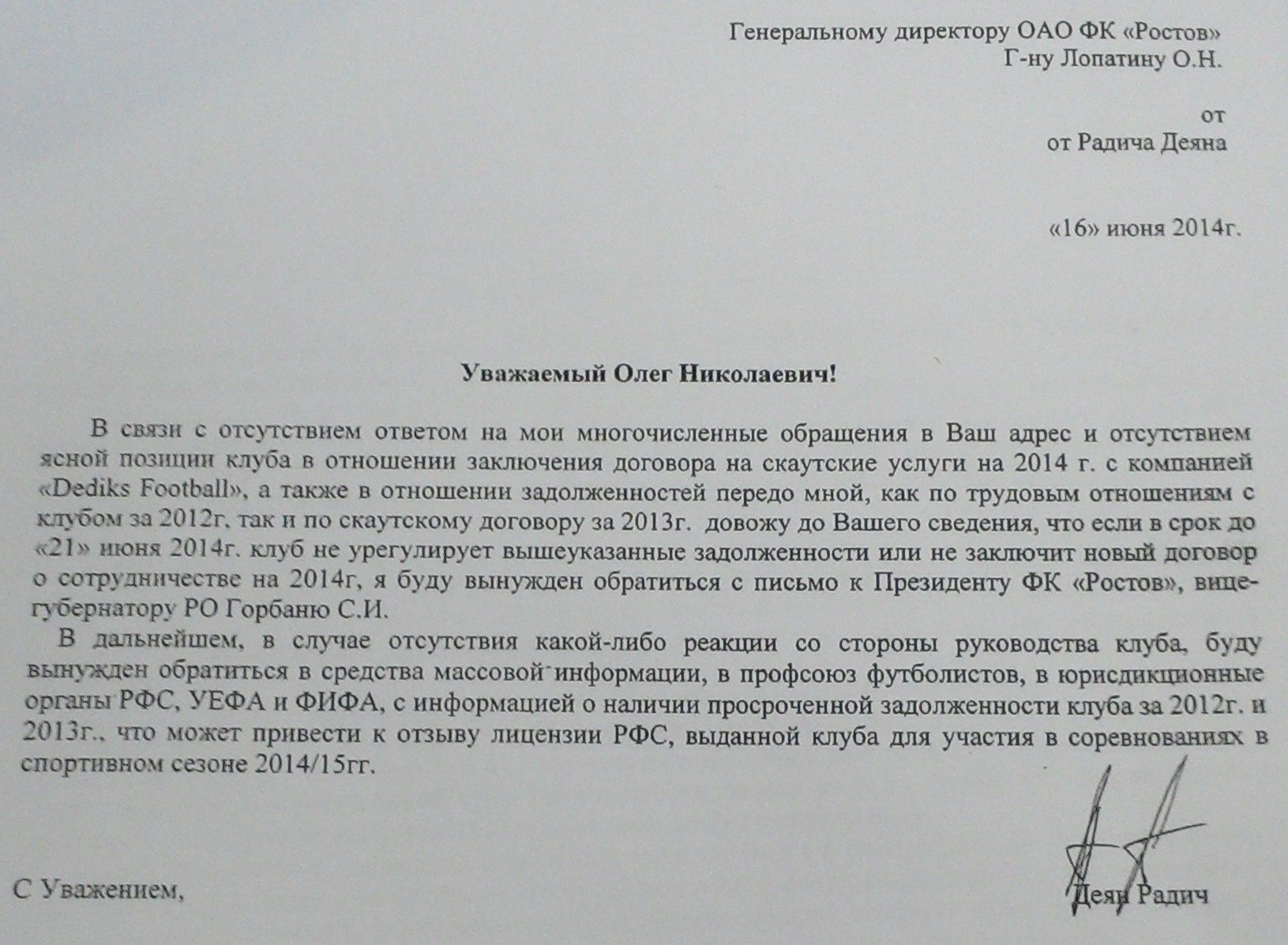 – Не удивлюсь, если так. Во всяком случае, после передачи Радичем документов в РФС в этом несложно увидеть определенную логику. Добавлю, что это не первая жалоба игроков "Ростова". В 2009 году точно такие же жалобы подали в палату по разрешению споров 4 игрока ростовской команды, в 2010-м – 1, в 2011-м – 3, в 2012-м – 10. Радич, кстати, прежде жалоб не писал.